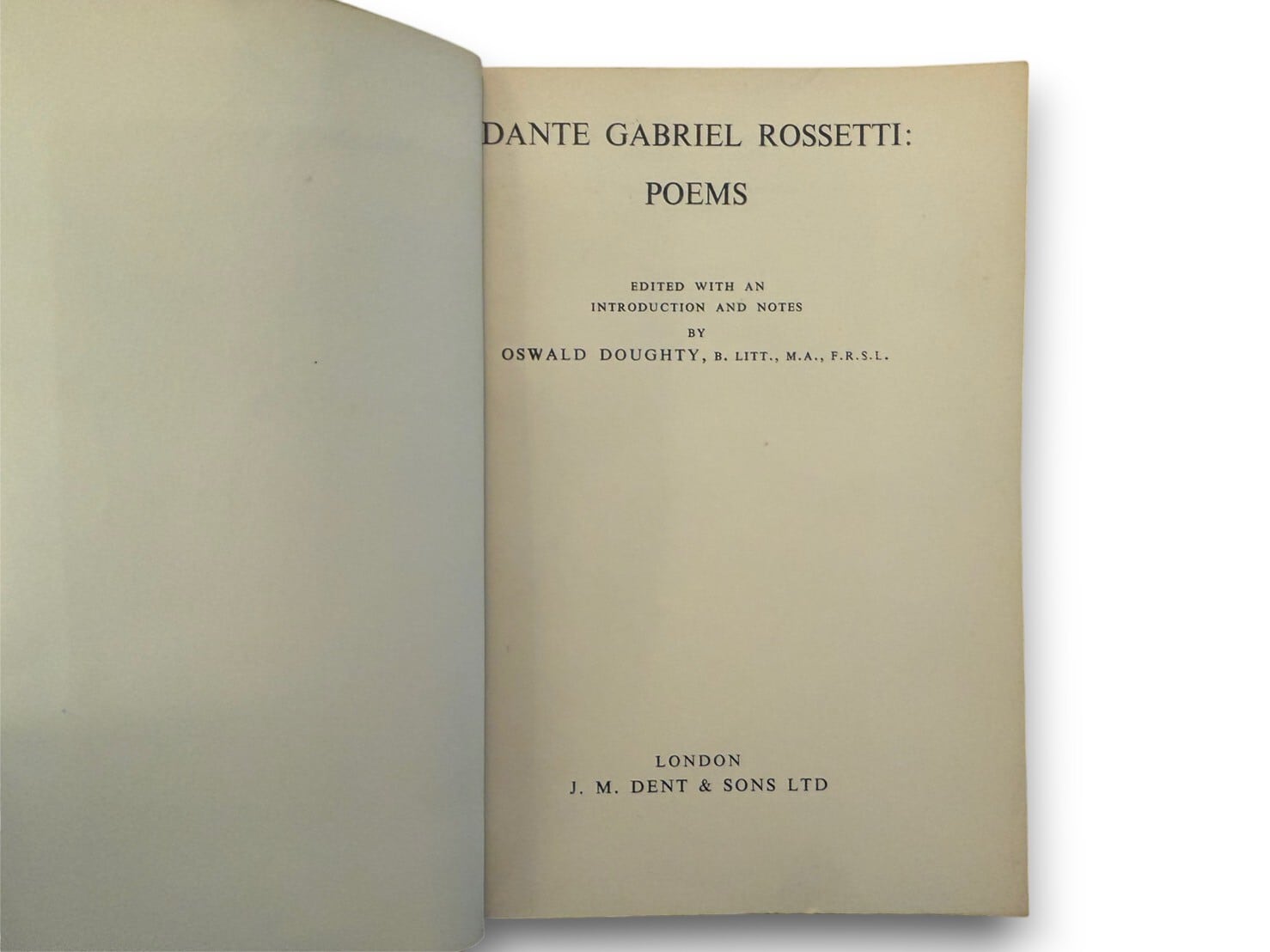 19世紀のイングランドの画家・詩人、ダンテ・ゲイブリエル・ロセッティ(1828-1882)による詩集。 総編集はOswald Doughty 。本書は1957年に刊行された、正式出版される前に関係者のみ手にすることができる、いわゆる“試し刷り”=“PROOF COPY”版。非常に珍しい1冊。