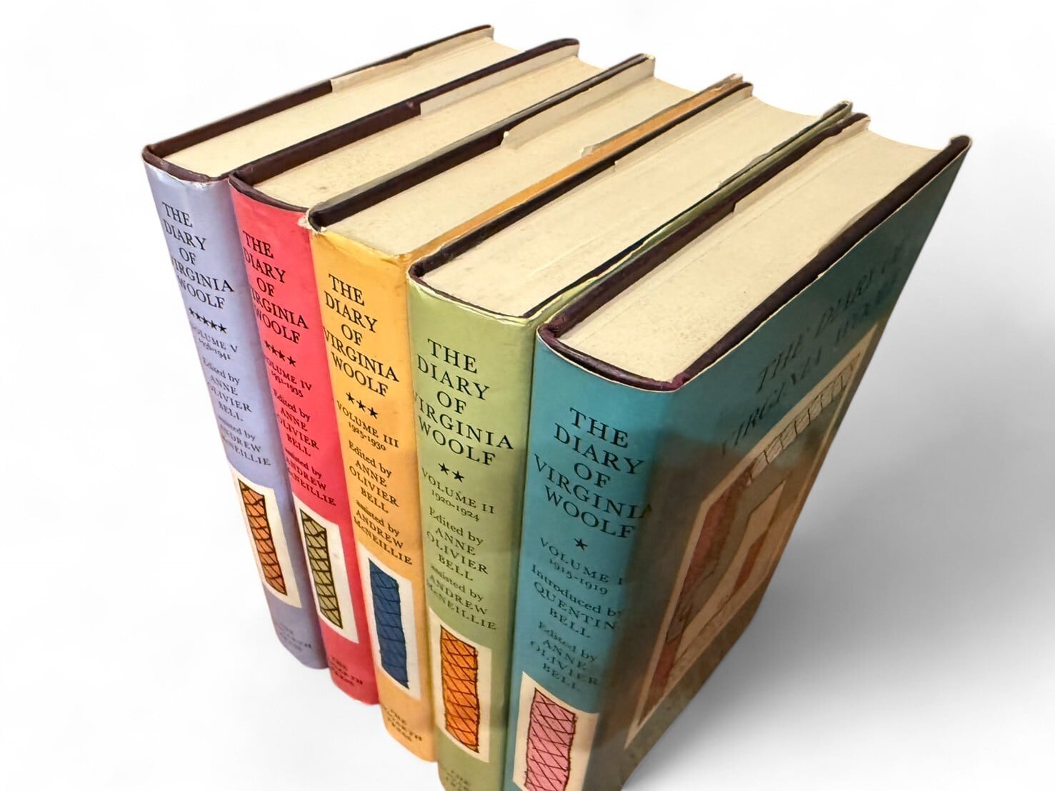イギリスの小説家、ヴァージニア・ウルフによる1915年33歳の年から1941年に入水自殺する直前までの日記。いま読んでいる本、創作過程、本の評判や売上げ、エリオットやフォースターとの交友、またウルフが抱えていた死、喪失、病気に対しての恐怖、人生において感じる悲嘆、憂鬱、苦悩などを記録。そしてその苦しみ以上に、創造することに楽しさや喜びを感じていたことが生き生きと伝わる素晴らしいダイアリー。初版全5冊揃い。非常に貴重。