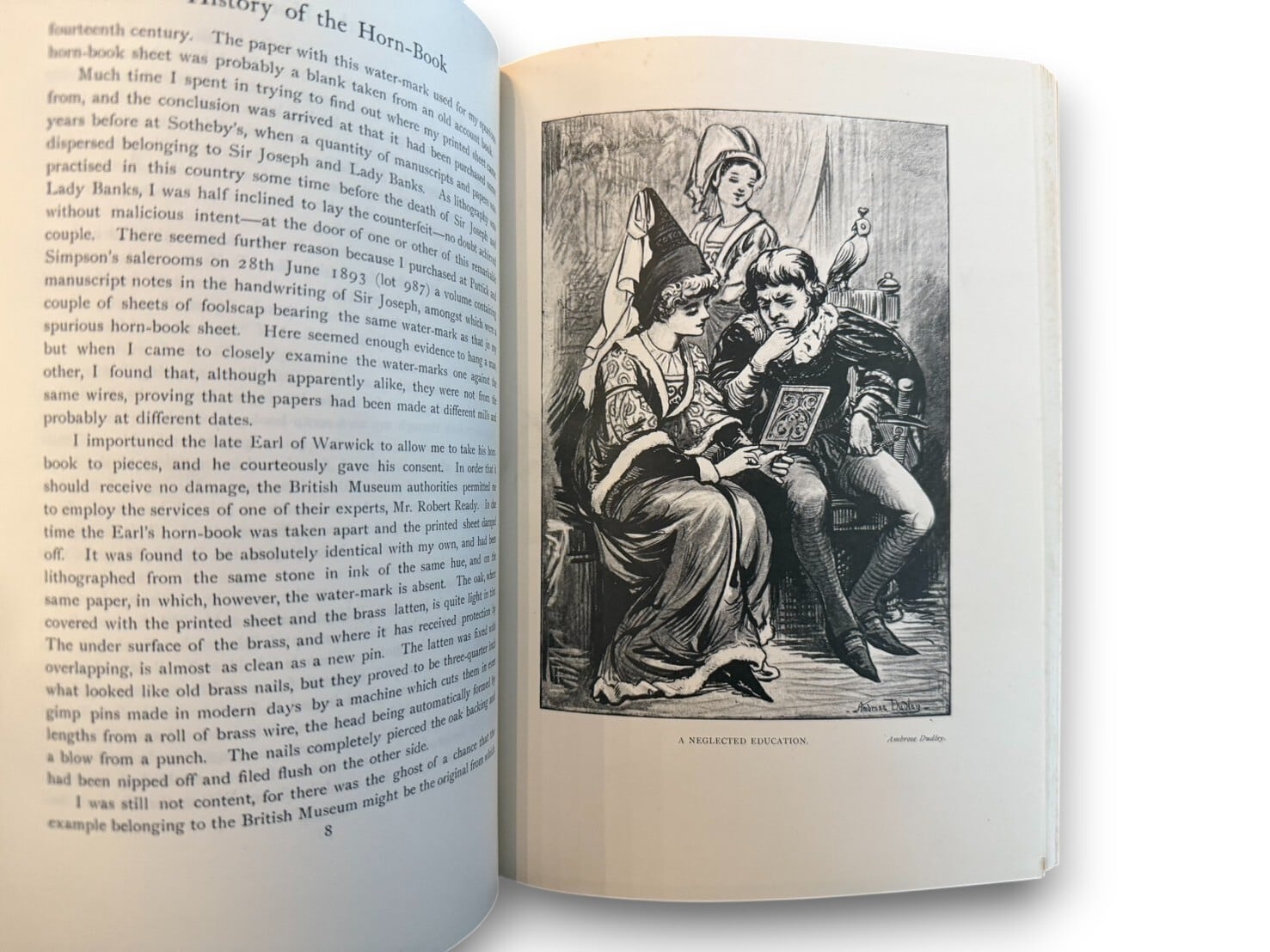 ホーンブックとは、15世紀から16世紀にかけて作られた教科書の原型とも言うべきもので、紙や羊皮紙に学ぶべきアルファベットや主の祈りなどを手書きまたは印刷し、それを保護するために薄く透明にした角で覆い、羽子板状の薄い板に貼りつけたものである。本書はそのホーンブックの歴史書で、図版付きで解説されている第1巻とレプリカのホーンブック付きの第2巻で構成されている。1896年刊行初版のリプリント。1971年刊行。