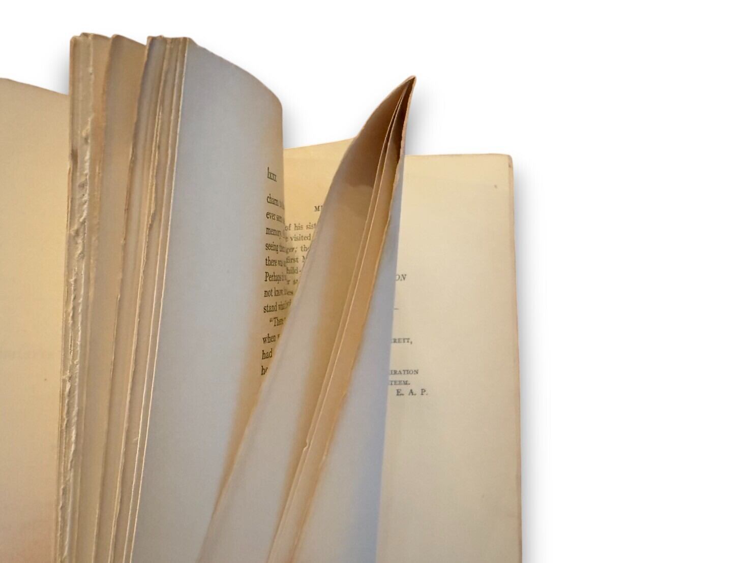 First edition, original black cloth with gilt title on spine, frontispiece of Poe's portrait, with 3 illustrations, upper part of spine torn, else still a usefull copy