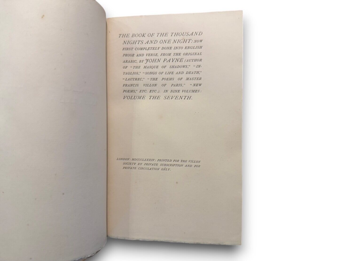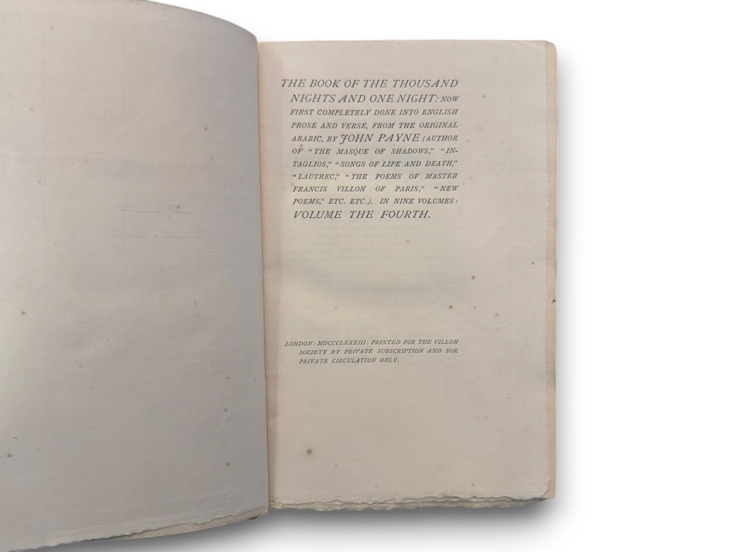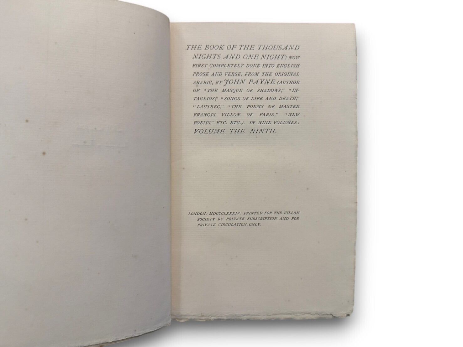 イギリスの 詩人、ジョン・ペイン(1842-1916)による「アラビアンナイト」初めての完全英訳本。(ウィリアム・マクナテン卿のアラビア語テキスト版、カルカッタ第二版に基づく)。豪華ヴェラム装丁。限定500部うち498部。1882-1884年刊行。全9巻揃。
