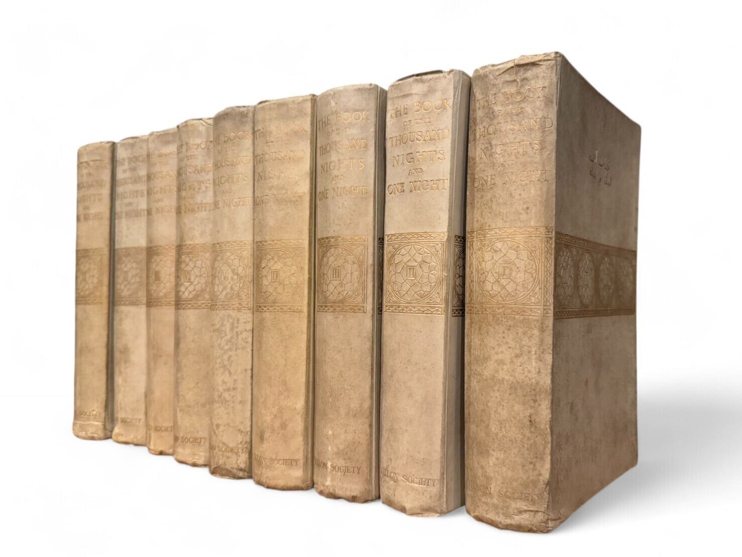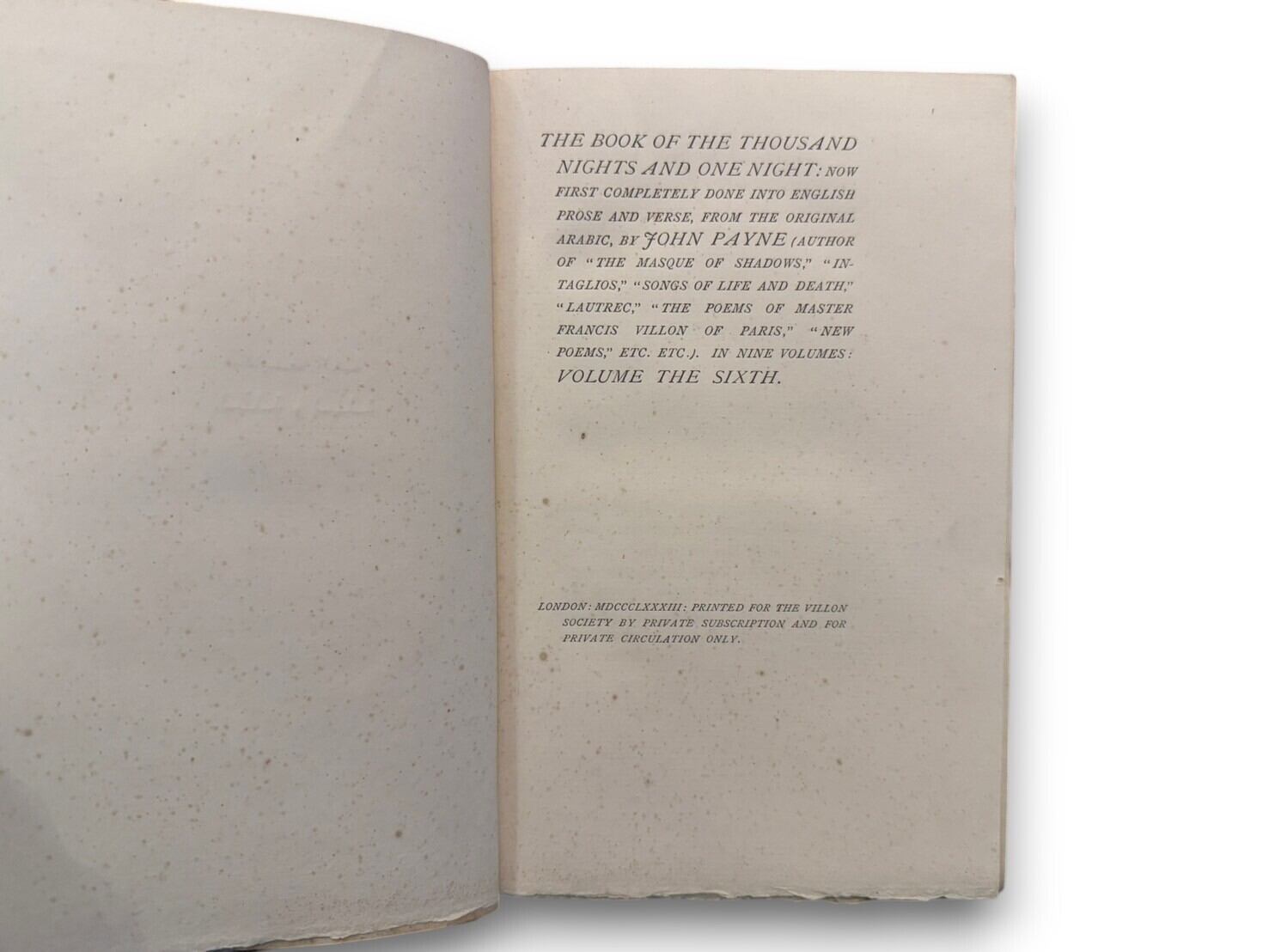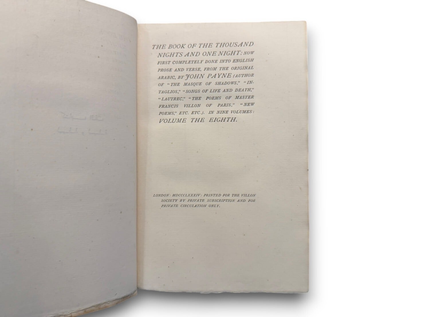 イギリスの 詩人、ジョン・ペイン(1842-1916)による「アラビアンナイト」初めての完全英訳本。(ウィリアム・マクナテン卿のアラビア語テキスト版、カルカッタ第二版に基づく)。豪華ヴェラム装丁。限定500部うち498部。1882-1884年刊行。全9巻揃。
