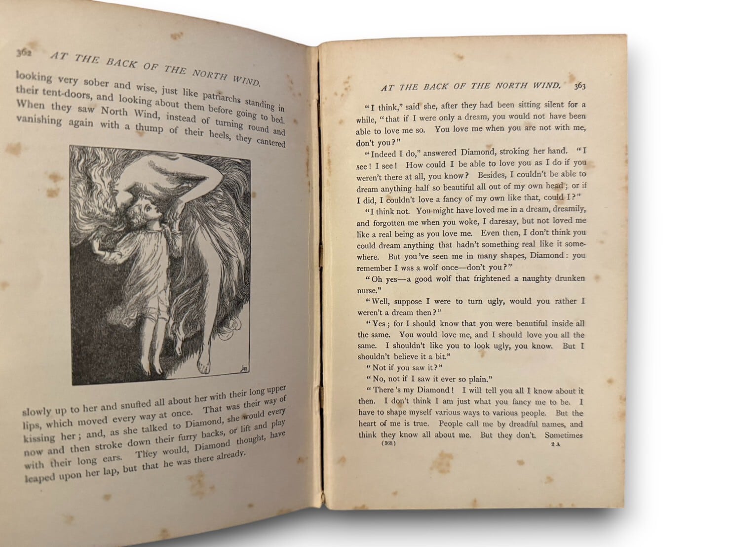 『リリス 』などの幻想文学などで知られるスコットランドの小説家、ジョージ・マクドナルド(1824-1905)による名作ファンタジー。邦訳に『北風のうしろの国へ』など。刊行年不明だが恐らく1909年ごろのものと推測される。イギリスの画家、アーサー・ヒューズ(1832-1915)による挿絵も多数収録。美しい装丁にも注目したい。