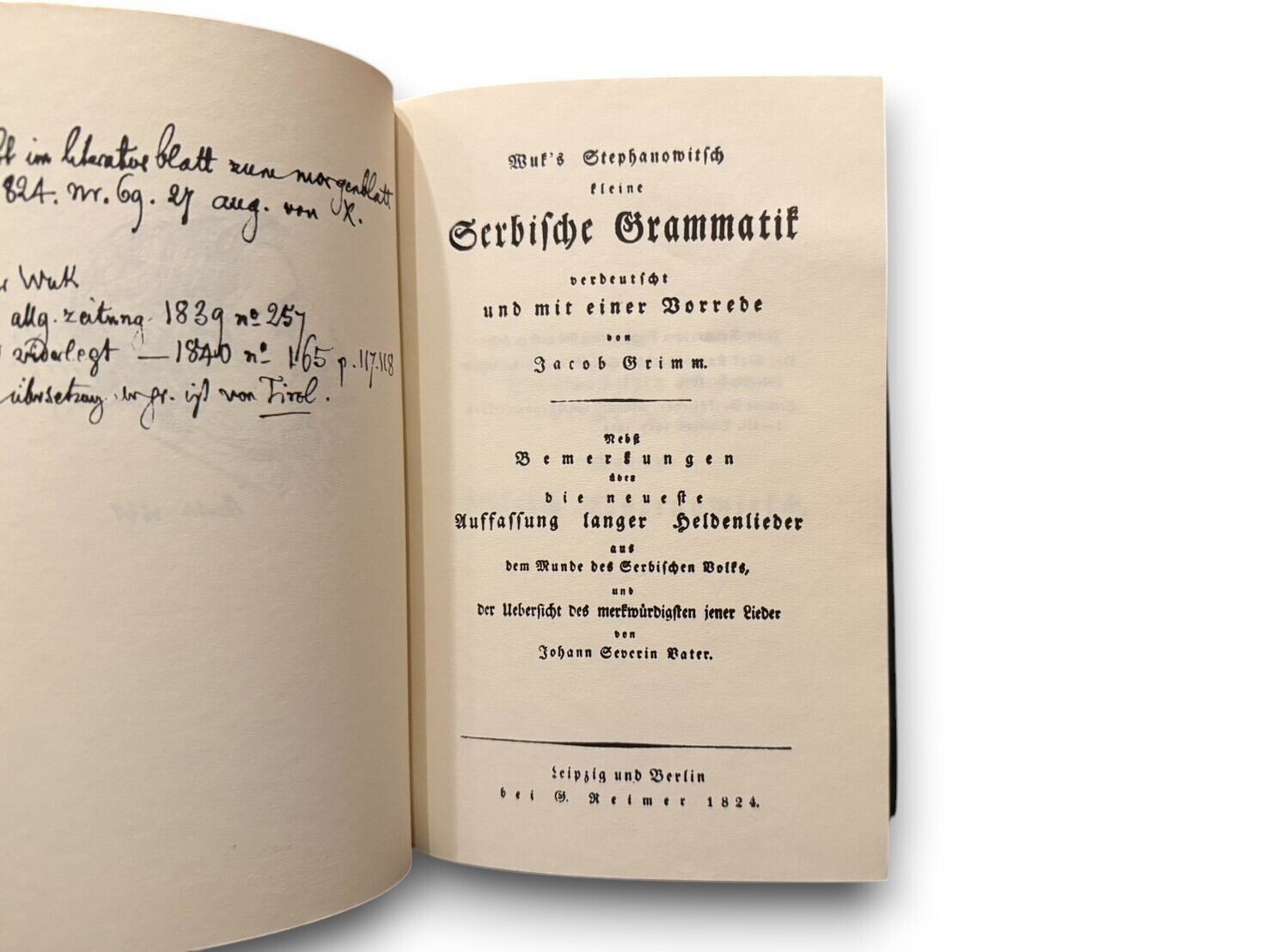 セルビアの言語学者、ヴク・カラジッチ(1787-1864)によるセルビア語文法。ドイツの言語学者で文学者、ヤーコプ・グリム(1785-1863)による翻訳。本書は1824年に刊行されたもののリプリント(序文、紹介文を除き髭文字)。