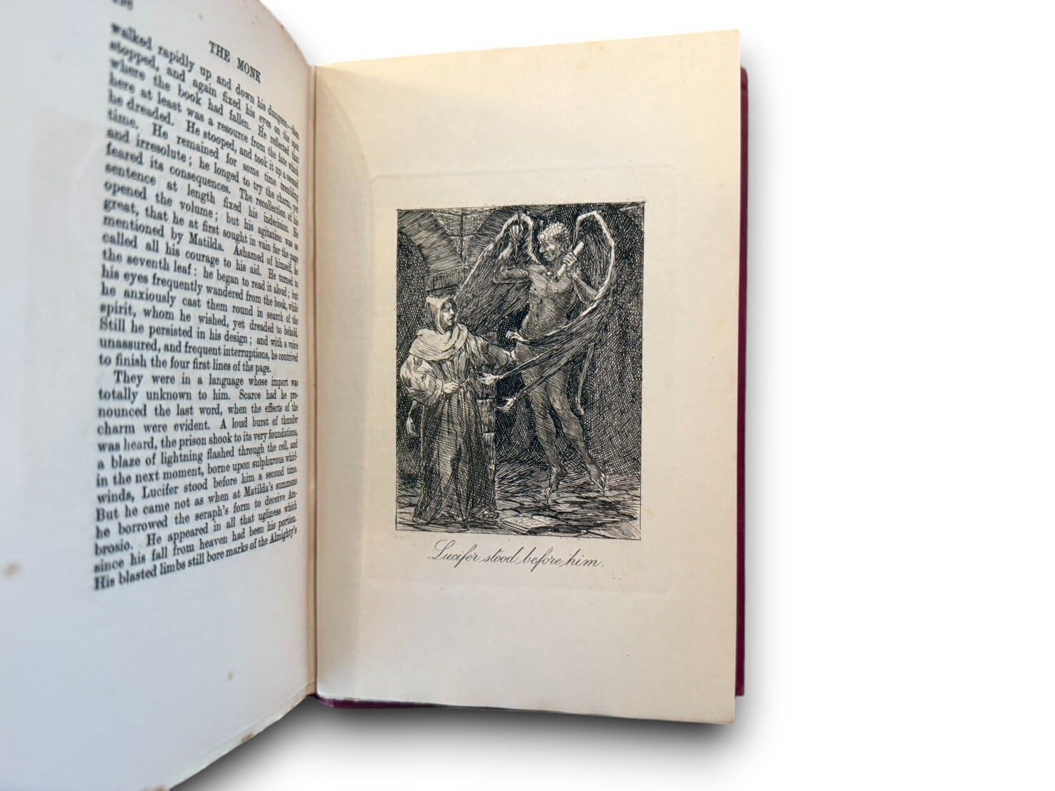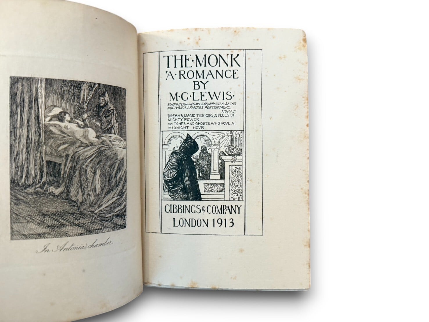 イギリスの小説家、マシュー・グレゴリー・ルイス(1775-1818)の代表作、『マンク』。好色な衝動に屈した高潔な修道士が一連の出来事を引き起こし、地獄に落ちるという恐怖のゴシック小説。1796年初版刊行当時、露骨な内容や強姦、近親相姦のテーマに世間は衝撃を受け、18世紀で最も物議を醸したゴシック小説となった。世論の激しい抗議があったが、小説は絶大な人気を博した。現代のホラージャンルに影響を与えた重要な作品。本書は1913年刊行。図版全揃、3巻本全揃。貴重。