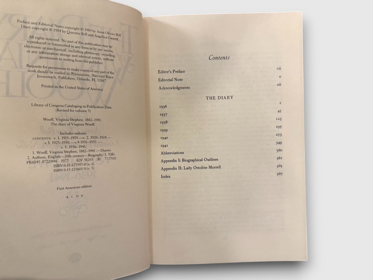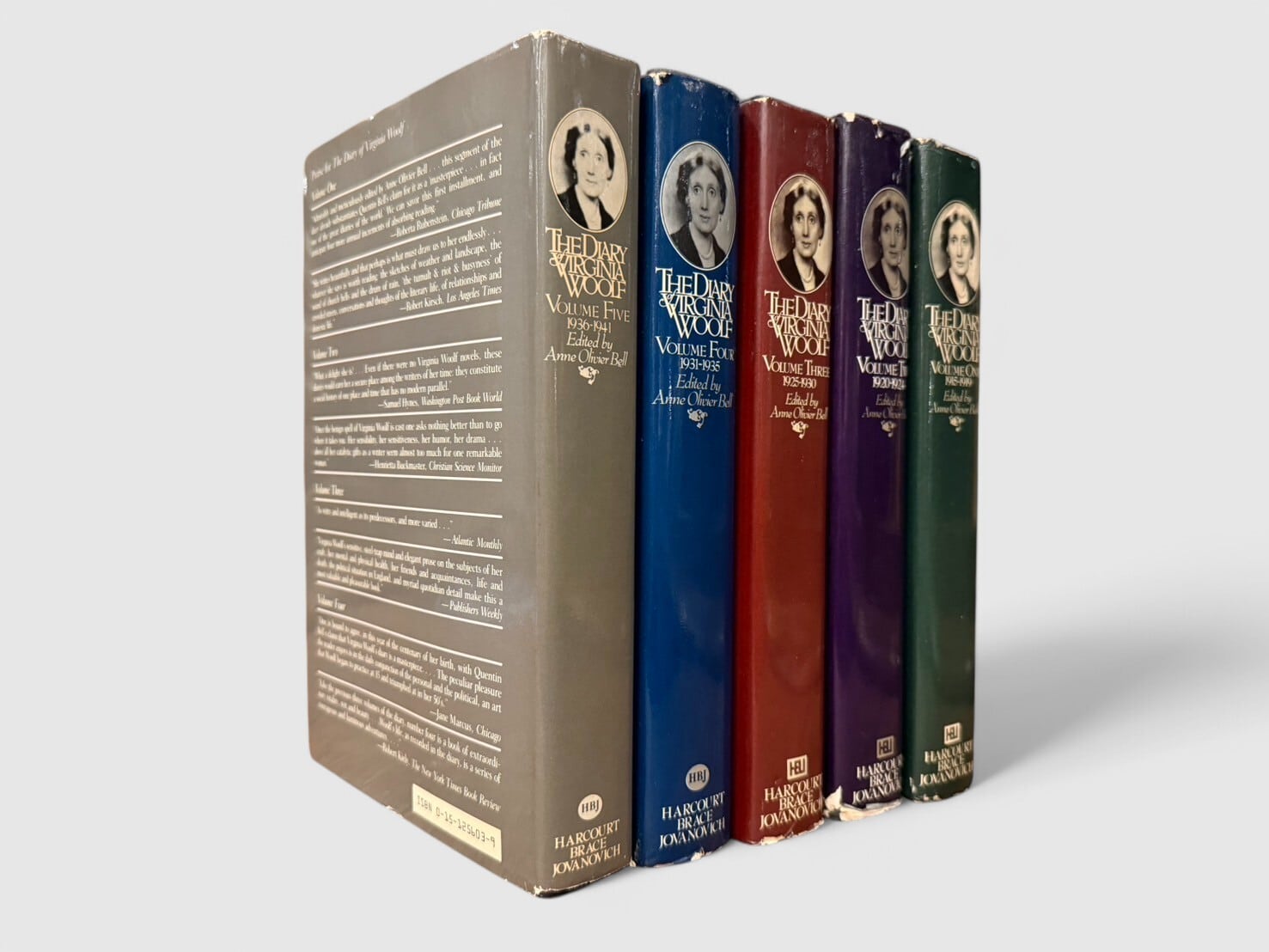 イギリスの小説家、ヴァージニア・ウルフによる1915年33歳の年から1941年に入水自殺する直前までの日記。いま読んでいる本、創作過程、本の評判や売上げ、エリオットやフォースターとの交友、またウルフが抱えていた死、喪失、病気に対しての恐怖、人生において感じる悲嘆、憂鬱、苦悩などを記録。そしてその苦しみ以上に、創造することに楽しさや喜びを感じていたことが生き生きと伝わる素晴らしいダイアリー。アメリカ版初版、全5冊揃。